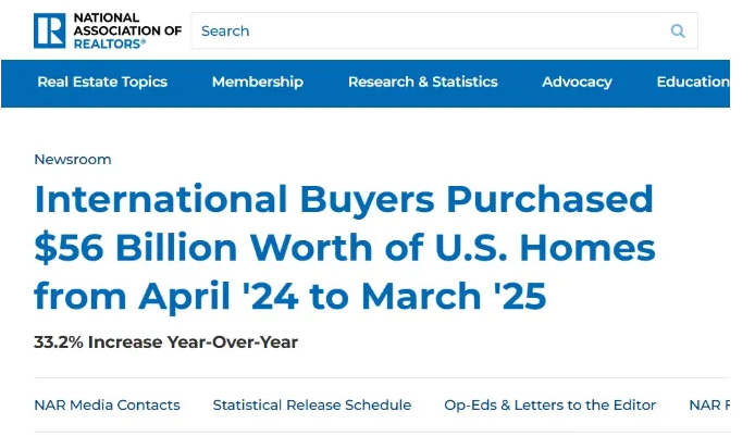 2025统计年度,外国资本对美国现房的购买量猛增三分之一,呈现出“本地冷、国际热”的奇特景象。中国买家以24.5%的份额位居第一,其75.96万美元的购房中位数,更是实力“抄底”的明证。